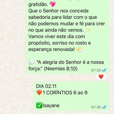 Sem problema! O plano foi criado para se encaixar em rotinas reais e corridas.Basta 10 a 15 minutos por dia para ler, refletir e orar — o suficiente para sentir a diferença em poucos dias.